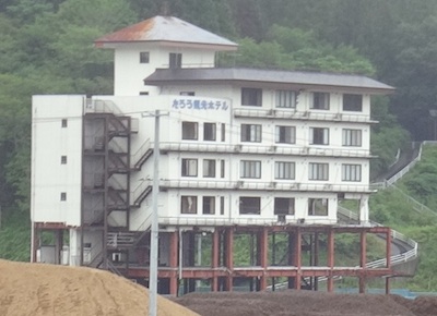 E地点の建物はたろう観光ホテルです。1-2階が津波で破壊され、3階以上が残っています。哀しさで胸がいっぱいになってきました。
