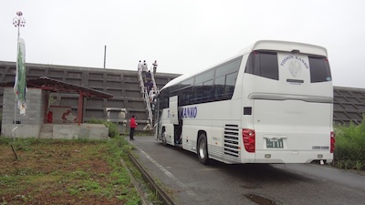 防潮堤から降りてみました。すると小さな路地へ一台の大型観光バスがやってきました。バスから降りた観光客は防潮堤に次から次へと登っていきました。