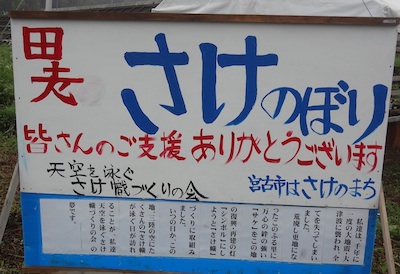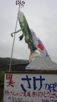 その近くには鯉のぼりならぬさけのぼりがありました。「田老さけのぼり 皆さんのご支援ありがとうございます。 天空を泳ぐさけ幟づくりの会  宮古市はさけのまち」と書いてあります。