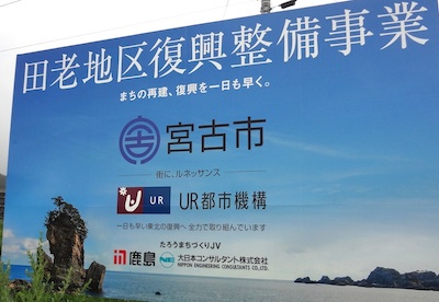 しばらく行くと、田老地区復興整備事業の看板がありました。鹿島建設と大日本コンサルタントとのJVやUR都市機構が中心になっているようです。