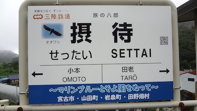 摂待駅の駅名標です。愛称は“旅の八郎”です。