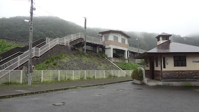 ホームから階段を下りてホームと待合室を見上げてみました。右手にあるのは公衆トイレです。