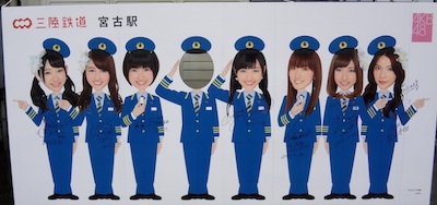 駅舎を出て左側にはAKBの大型看板がありました。空いている穴から顔を出して記念写真が撮れますね。