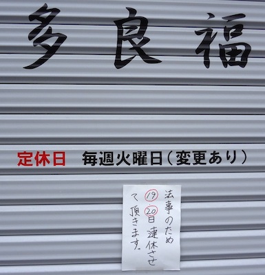量は少なめだったので、欲を出して以前行った多良福でもう一杯食べようとしたら、ガーン! 法事のために昨日・今日と連休でした。