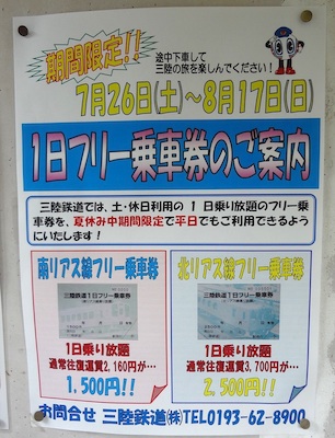 待合室には夏休み中の7月26日(土)〜8月17日(日)に限り、平日にも1日フリー乗車券が利用できる案内が貼ってありました。
