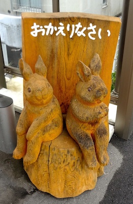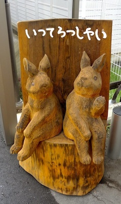 木彫りのうさぎが「いってらっしゃい」と「おかえりなさい」と送り迎えしてくれます。