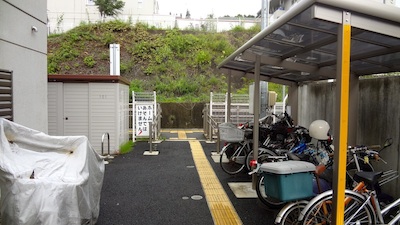 団地の自転車置き場のその奥が駅入口ですから、これではわかりませんね。