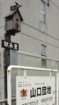 この駅には立派な巣箱の駅長室がありました(笑)。ほのぼのしますね。木彫作家の植野義水(よしみ)さんの作品だそうです。