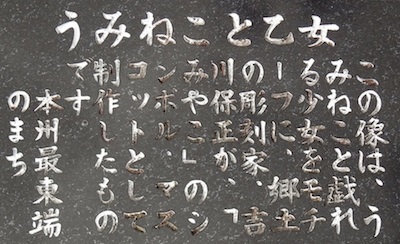 「うみねこと乙女」 この像は、うみねこと戯れる少女をモチーフに、郷土の彫刻家、吉川保正が「みやこ」のシンボル・マスコットとして制作したものです。本州最東端のまち。 と書いてあります。