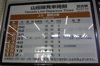 盛岡まで行く列車は1日わずか4本しかありません。しかもこれから乗ろうとする9時31分発の快速リアスの次は15時54分までありません。6時間以上も空いてしまいます。岩手県北バスは、盛岡と宮古を2時間15分で結び、1日18便も出ています。これじゃぁ、バスを利用したくなっちゃいますね。
