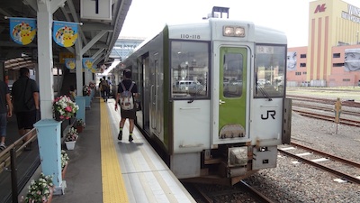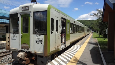 快速リアスの車両です。2両編成でほぼ満席です。私はボックス席に相席で座りましたが、高校生たちは立っています。相席のお相手は二人のおばちゃんです。長野県の佐久出身の二人でした。さすがおばちゃん、よくしゃべります。あっという間に仲良くなりました。田野畑近くの羅雅荘へ行ってきたそうです。来るときも盛岡から山田線を利用したそうですが、その列車も満席で、お客さんの中には床に直接座った人もいたそうです。そういう経験があるので改札口に行列をしていたのだそうです。仲良くなると、これ食べない? と言って次から次へと食べ物が出てきます。おせんべい、チーズ、イカ、帆立、なんでも出てきちゃいそうです(笑)。御礼を言っていただきました。おばちゃん、どうもありがとうございました。