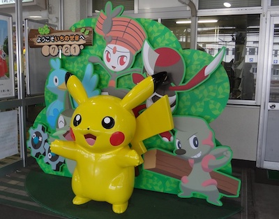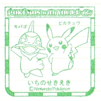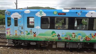 区界駅で列車交換です。対向列車はポケモントレインでした。車内にもポケモンがあちらこちらに描かれていました。