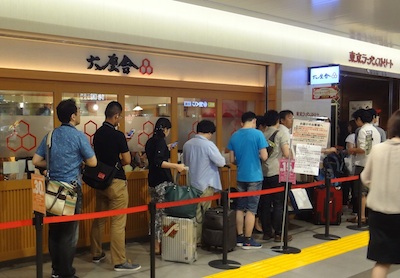 新幹線を降りてから、ダメもとで東京ラーメンストリートの六厘舎の行列を見に行きました。すると、奇跡が起こりました。いつもいつも1時間半〜2時間待ちくらい行列の途切れないお店なのに、5-6人しか並んでいません(写真は食べた後で撮影)。行列の時間表示ではわずか15分待ちです。これは並ぶしかないでしょう。