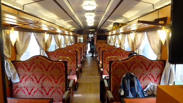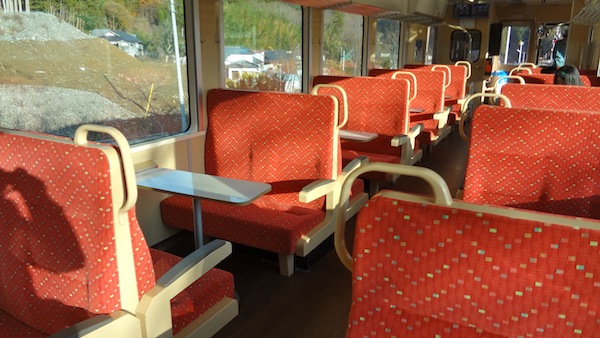 列車は2両で、2両目はレトロ車両です。海側の座席はいっぱいだったので、空いていた山側の座席に座って過ごします。