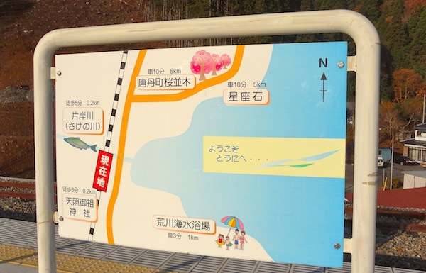 駅名標には「さけのふるさと」と書いてあり、観光案内には「片岸川(さけの川)」と書いてあります。