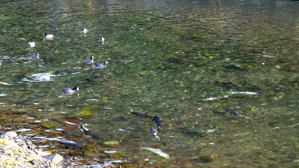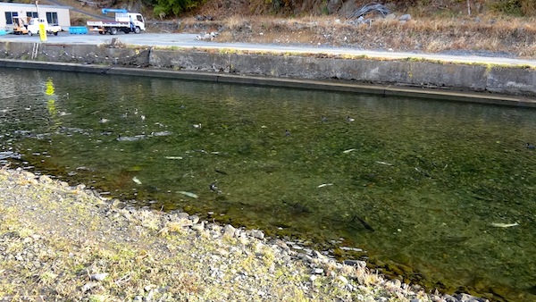 駅のすぐ近くを流れる片岸川のほとりに出てみました。河口を泳いでいるのはさけの大群です。おー、すごい!