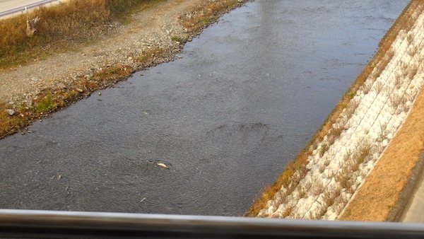 唐丹駅を過ぎたところでは片岸川を見下ろせます。車内からもさけの様子を見ることができました。