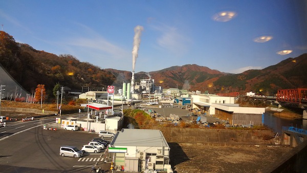 釜石駅に近づいてきました。新日鉄住金釜石工場から工場の稼働を示す煙が立ち上っています。