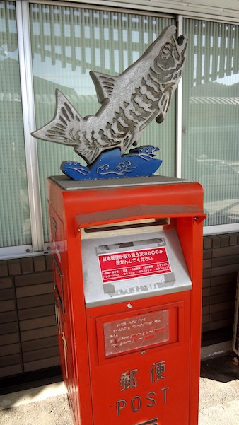 駅前にあるポスト。よくみるとさけが乗っています。