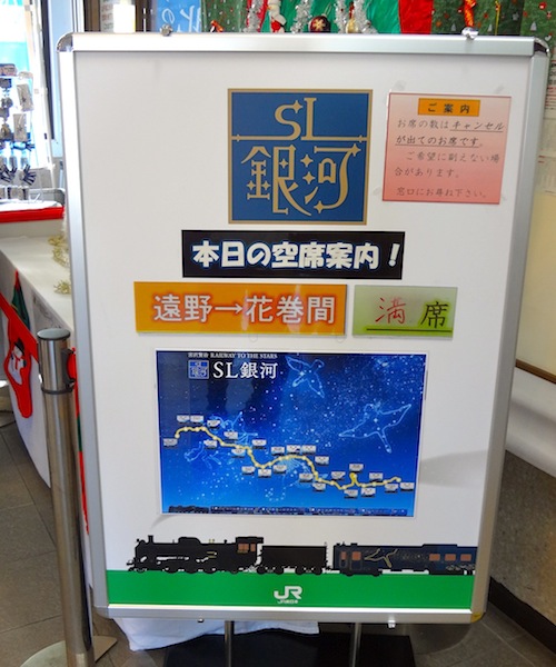 改札を出たところにはSL銀河の空席案内があり、「遠野→花巻間 満席」となっています。すごい人気ですね。