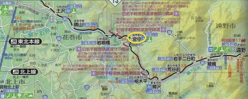 宮守の街に入ると、すぐに宮守駅に到着しました。この駅の愛称はガラクシーア・カーヨ(銀河のプラットホーム)です。これはこの近くの宮守川橋梁(めがね橋)の旧橋が宮沢賢治の「銀河鉄道の夜」のモチーフになったことからつけられたのでしょう。