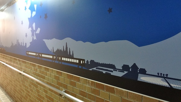 新幹線駅への連絡通路の壁には銀河鉄道の夜をイメージした絵と、釜石線の地図が描かれていました。