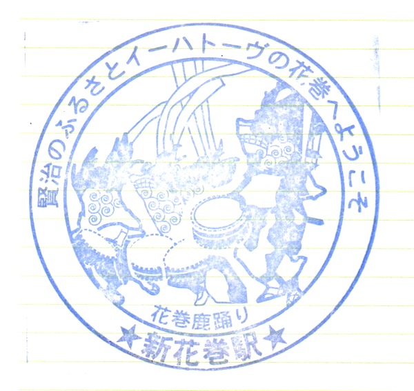 駅スタンプです。賢治のふるさとイーハトーブの花巻へようこそという文字と、花巻鹿踊りが描かれています。