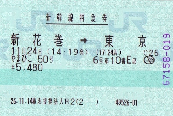 新花巻14時19分発の東北新幹線やまびこ50号で帰路につきます。わずか3時間5分で東京に到着しました。そして新宿を経由して小田急線で伊勢原まで帰りました。天気に恵まれ、楽しい鉄道の旅でした。