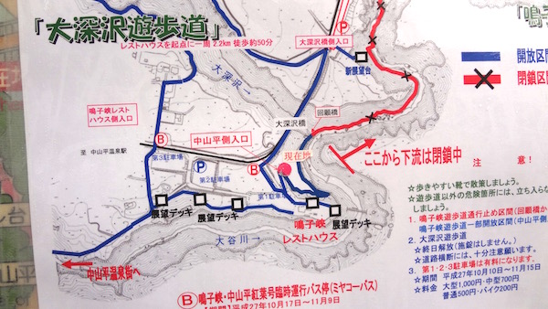 鳴子峡遊歩道は鳴子温泉駅近くから鳴子峡レストハウスまで続いていますが、現在は東側の多くは閉鎖中になっています。