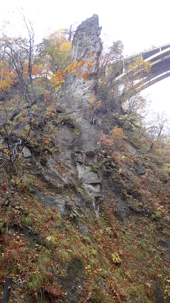 遊歩道の終点で、上を見上げると大深沢橋を見上げることになりました。大きな岩が天に向かって突き出ています。