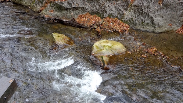 鳴子峡遊歩道を下りていきます。ポスターに写されていた橋を下から望みます。赤や黄色の葉がきれいですが、緑色も生えています。
