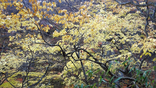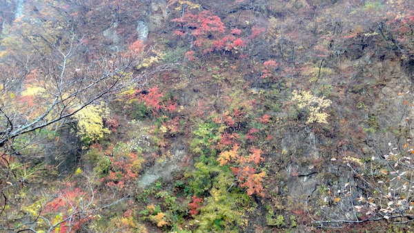 鳴子峡レストハウス付近からの紅葉です。雨も小雨になってきました。