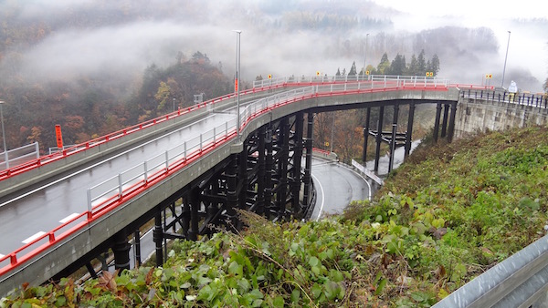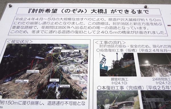 「平成24年4月〜5月の大規模な地すべりにより、県道戸沢大蔵線が約150mにわたり崩落し通行止めとなりました。この路線は、肘折地区と新庄方面を結ぶ重要な路線で、冬期間は地区外へ出るための唯一の道路となっています。このため、冬までに通れる道路の復旧として240.5mの橋梁が計画されました。」