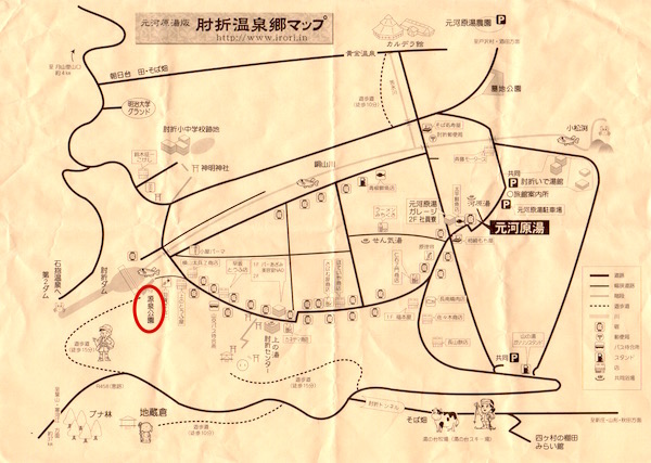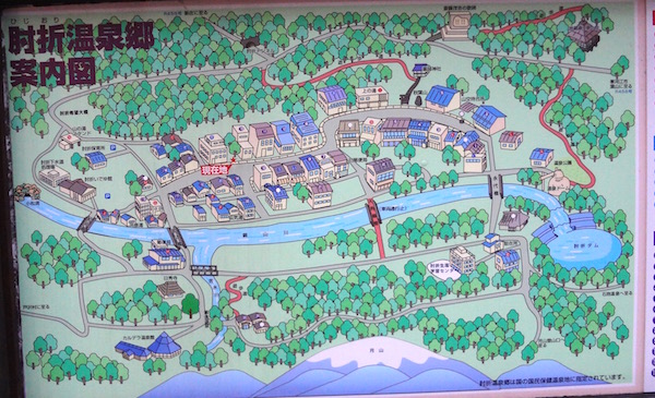 まだ夕食までに時間があるので、肘折温泉を散策してみます。地図右手の元河原湯から地図左手の赤丸の源泉公園まで歩いてみましょう。