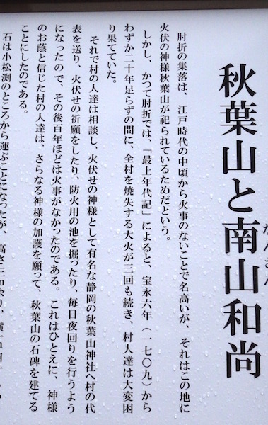 「かつての肘折の集落では宝永六年(1709)からわずか20年足らずの間に大火が三回も続いたため、火伏せの神様として有名な静岡の秋葉山神社へ村の代表を送るとともに、ここに秋葉山の石碑を建てることにした」と記載されています。