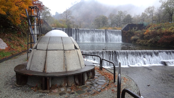 ちょっと見にくいのですが「肘折源泉公園」と書いてあります。遠くに見えるのは肘折ダムです。
