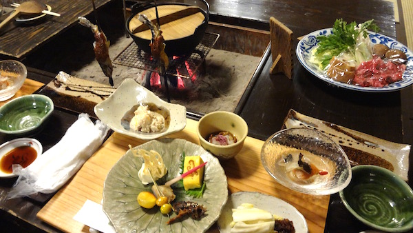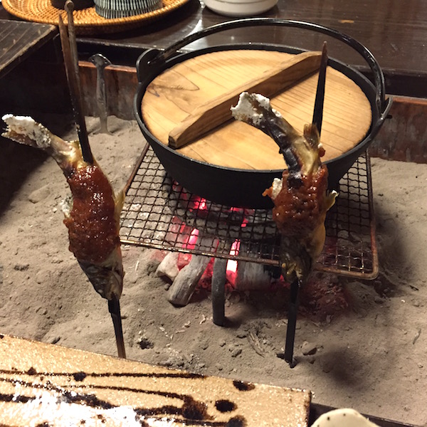 夕食はご覧のように風情あふれる囲炉裏端です。
