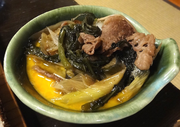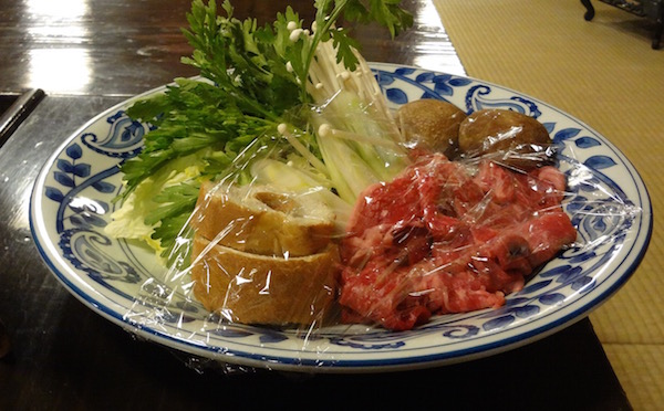 鍋の具材です。山形牛、しいたけ、野菜、麩などがあります。