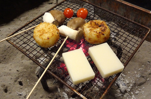 この火で焼き物です。味噌おにぎりに餅と串焼きです。斜め前に座った母親と息子(息子と言っても50歳代)の母親が息子に「貧乏人は餅を早めに裏返すのよ」と話していました。斜め前で、餅を裏返していたのは、、、私です(涙)。聞こえるような声で言わなくてもいいのになぁ。妻と目を合わせて笑いました。