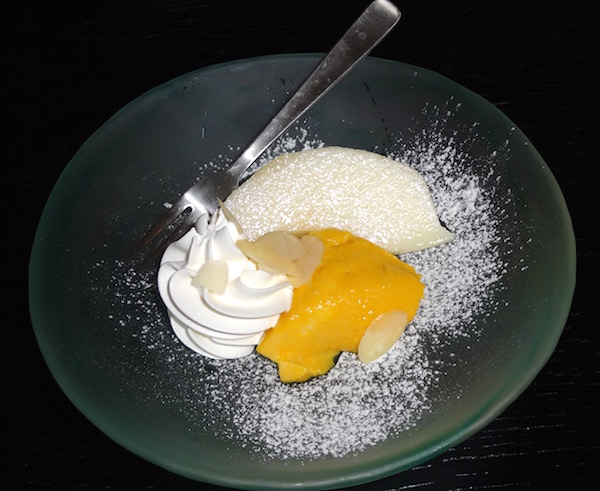 そばを食べ終えて部屋へ戻ったのですが、「お客さん、デザートをお忘れですよ」と部屋まで持ってきていただきました。まだ夕食が続いていたのですね。ご足労をおかけいたしました。美味しくいただきました。甘いものは別腹ですね(笑)。