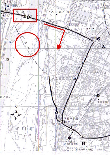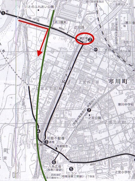 河原橋に着きました。あれっ、ちょっと地図と違うようです。地図の(4)から(3)への道路が地図と異なるのです。ちょうど測量の仕事の方が前方から歩いてきたので、「お仕事中失礼しますが、この橋(河原橋)は以前からこの場所にありましたか?」と尋ねると「そうだと思いますよ。」という返事でした。「実は昔の大山道を歩いているのですが、地図と違うのですよ。」といっても「少なくとも私がこの仕事をしてからこの場所にありますよ。」ということでした。