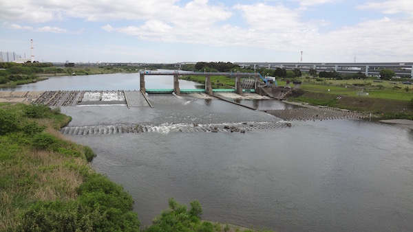 上流には寒川浄水場の取水堰が見えます。