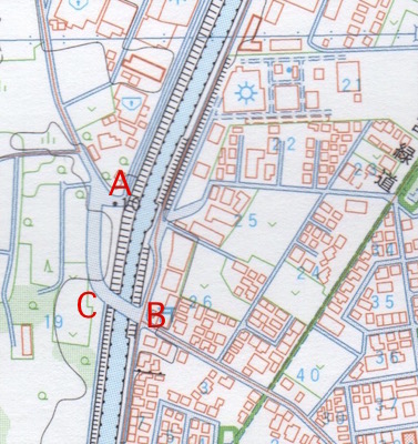 これは2002年(平成14年)1月1日発行の1/10,000地形図寒川です。これによるとA→C→Bとなり、C→Bの間に橋があることになります。この欄の最初の地図もこれを利用しているので同じになっています。