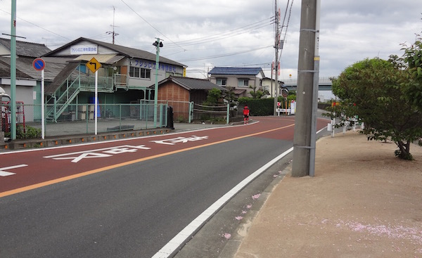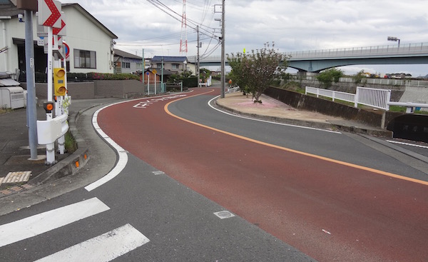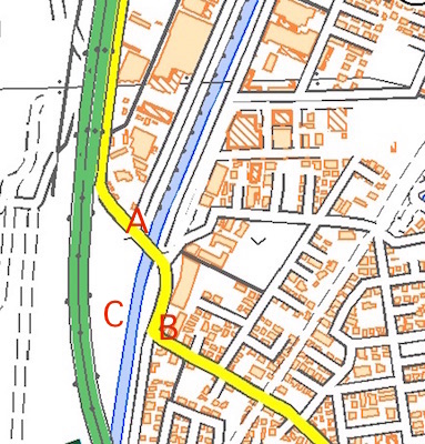 河原橋を渡ったところからBの地点までの道路と歩道は新しいものになっています。なんだか不自然です。