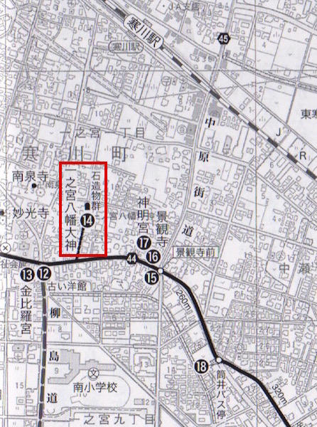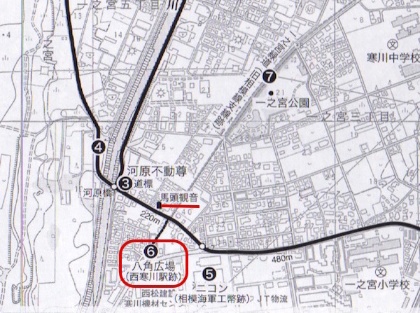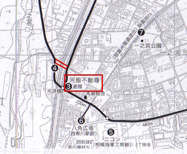 地図では河原橋のすぐそばにある河原不動尊です。(本当はここに河原橋はなく、(4)の上の赤二重線の場所です。)
