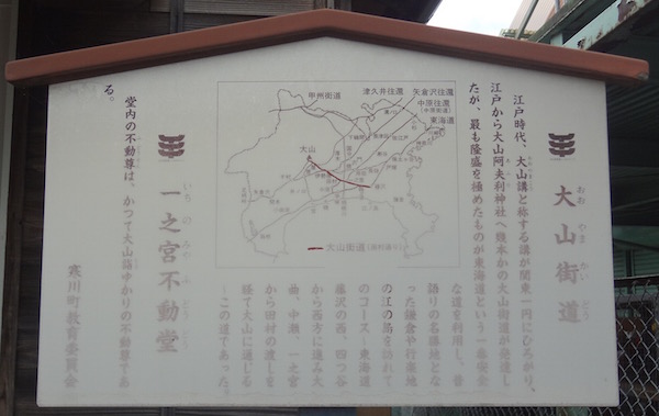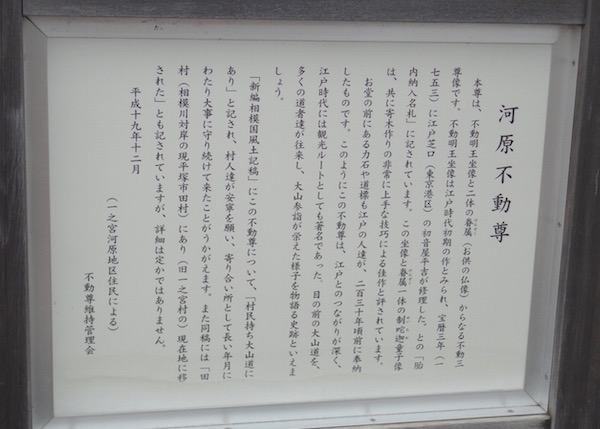 このようにこの不動尊は、江戸とのつながりが深く、江戸時代には観光ルートとしても著名であった。目の前の大山道を、多くの道者達が往来し、大山参詣が栄えた様子を物語る史跡といえましょう。「新編相模国風土記稿」にこの不動尊について、「村民持ち大山道にあり」と記され、村人達が安寧を願い、寄り合い所として長い年月にわたり大事に守り続けて来たことがうかがえます。また同稿には「田村(相模川対岸の現平塚市田村)にあり(旧一之宮村の)現在地に移された」との記されていますが、詳細は定かではありません。
