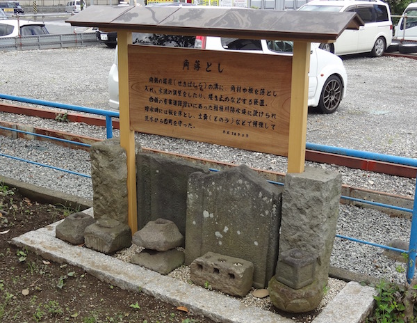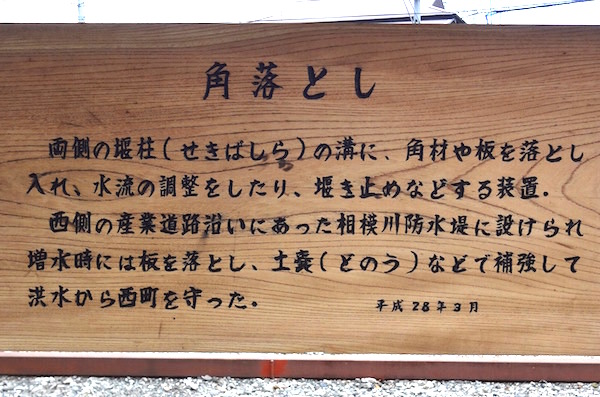 「両側の堰柱(せきばしら)の溝に、角材や板を落とし入れ、水流を調整したり、堰を止めなどする装置。西側の産業道路沿いにあった相模川防水堤に設けられ増水時には板を落とし、土嚢(どのう)などで補強して洪水から西町を守った。