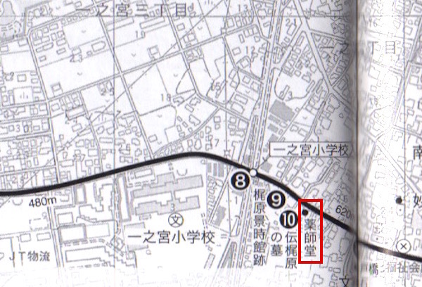 薬師堂の裏にある地図(10)の「伝梶原氏一族郎党(七士)の墓」に行くのですが、東側から回り込む必要がありそうです。