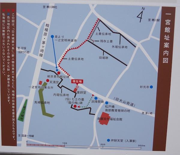 「梶原景時は治承四年(一一八〇年)八月、源頼朝挙兵の時、石橋山の合戦で洞窟に逃れた頼朝の一命を救いました。翌年正月、頼朝の信任厚い家臣となり、鎌倉幕府の土台を築くのに貢献しました。一宮を所領としており、この地に館を構えたとされています。図に示すとおり館の規模は広大だったとの説もあり、現在も当時の堀のなごりを留めていると伝えられています。天満宮の位置はその一角で、当時は物見の場所として一段と高く構築したとも伝えられています。