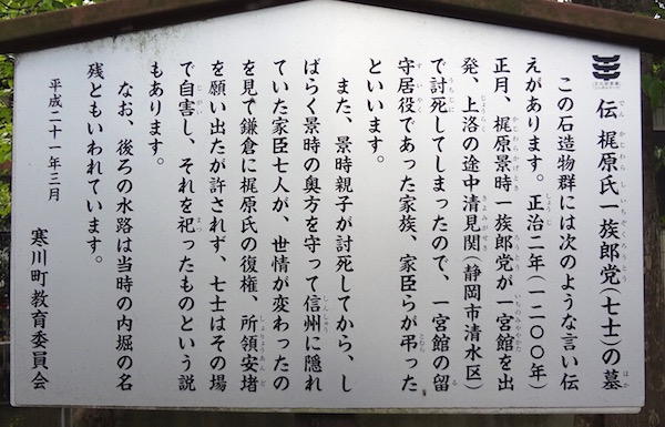 「この石造物群には次のような言い伝えがあります。正治二年(一二〇〇年)正月、梶原景時一族郎党が一宮館を出発、上洛の途中清見関(静岡市清水区)で討死してしまったので、一宮館の留守居役であった家族、家臣らが弔ったといいます。また、景時親子が討死してから、しばらく景時の奥方を守って信州に隠れていた家臣七人が、世情が変わったのをみて鎌倉に梶原氏の復権、所領安堵を願い出たが許されず、七士はその場で自害し、それを祀ったものという説もあります。なお、後ろの水路は当時の内堀の名残ともいわれています。